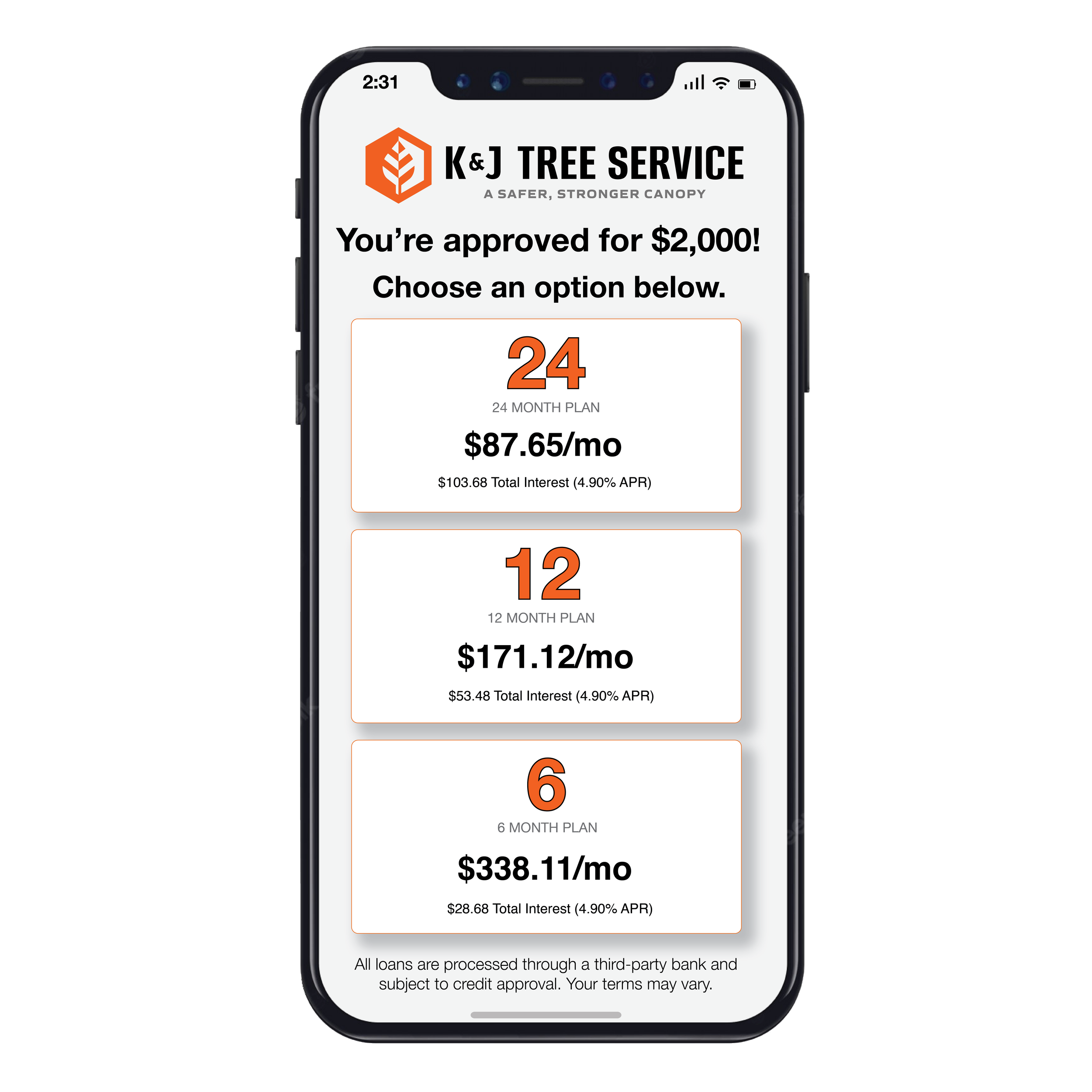 Approved applicants will receive up to six loan options. Choose the monthly payment amount that best fits your budget.